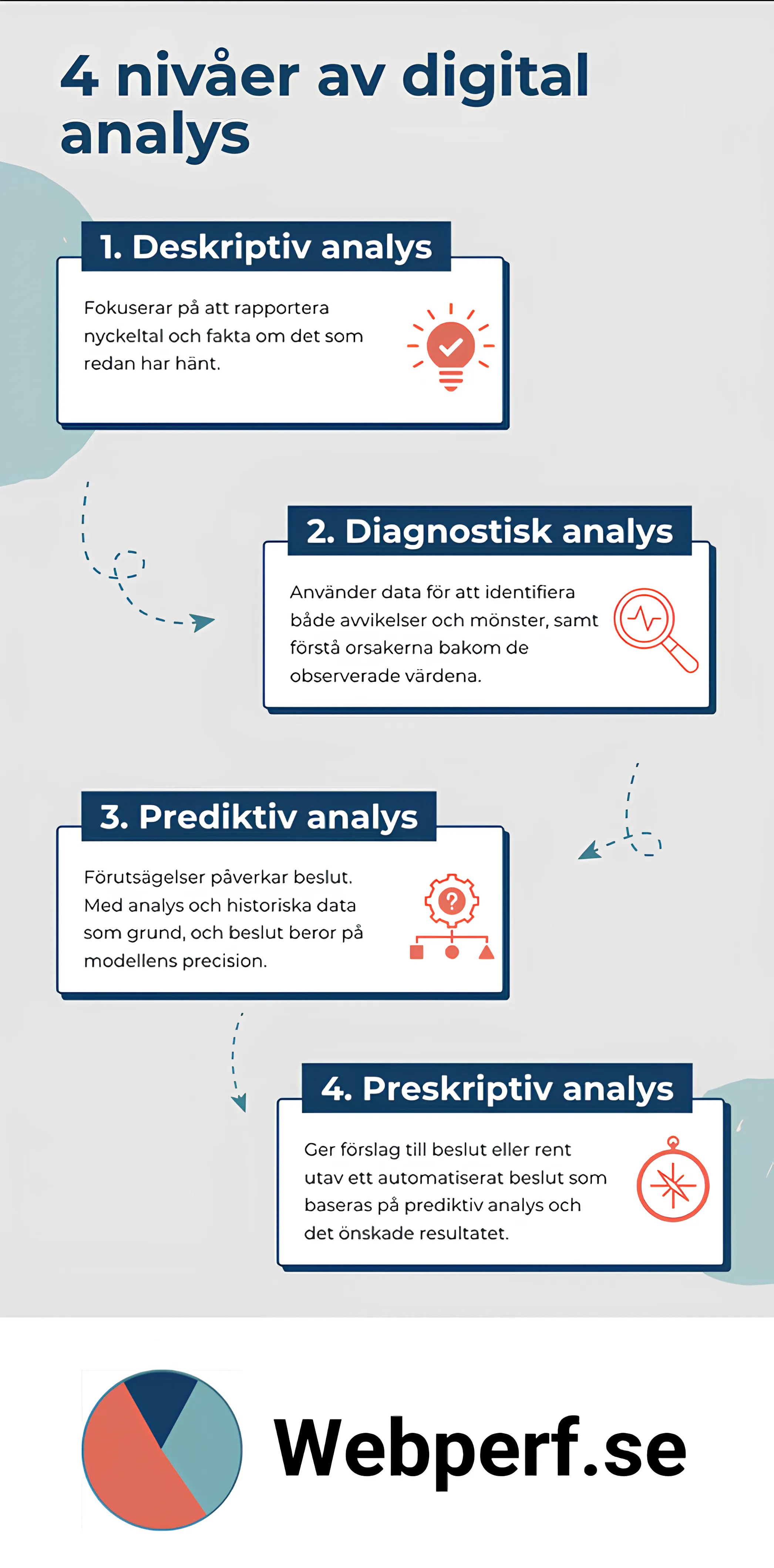- Fyra analysnivåer bygger på varandra. Deskriptiv analys visar vad som hänt, diagnostisk förklarar varför, prediktiv förutser framtiden och preskriptiv rekommenderar åtgärder.